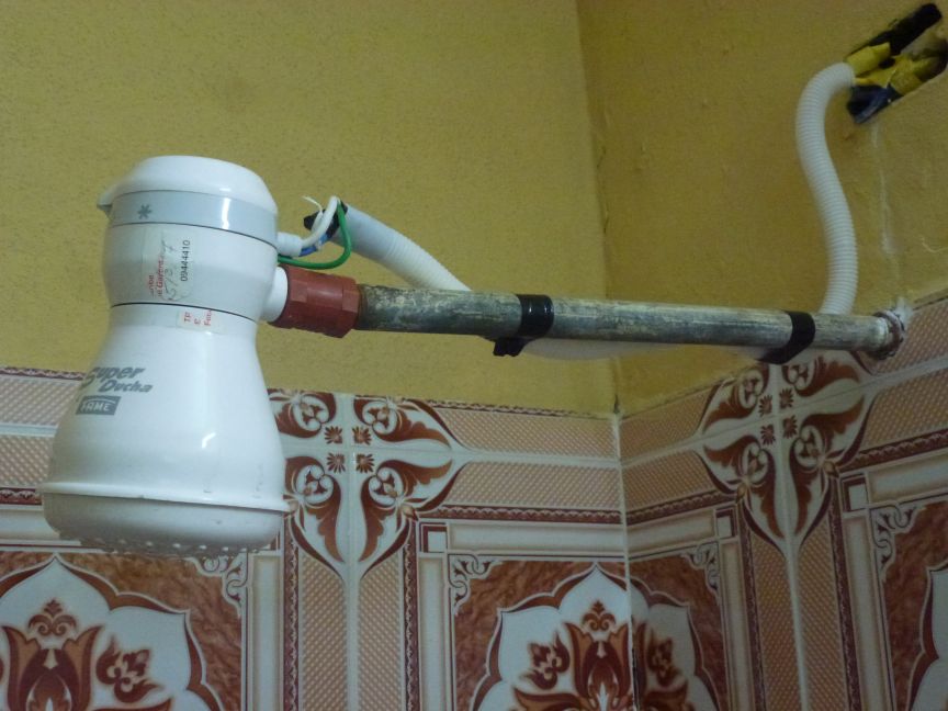 gehörte auch ein Bad mit einem Durchlauferhitzer der Marke Super Duche (Foto rechts)