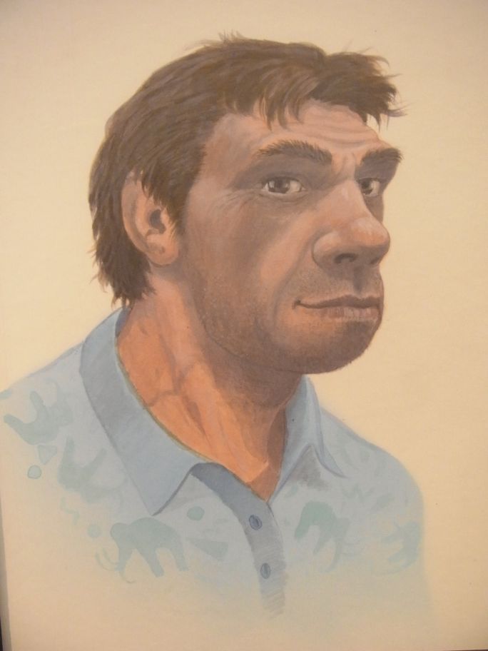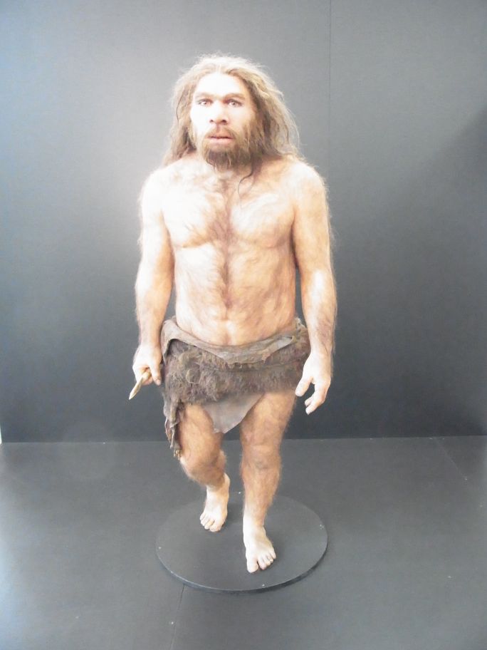 Das lebensgroße Modell eines Neandertalers (Foto Mitte)