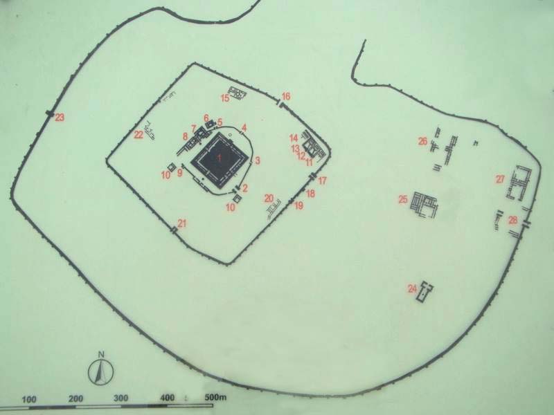 der wiederum von einer Mauer umfriedete 470 x 380 Meter