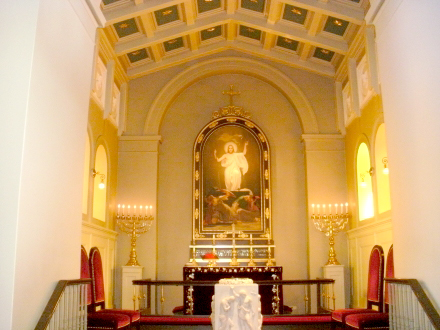 Geschoss mit Galerie (Foto links), der Chor (Foto rechts) und