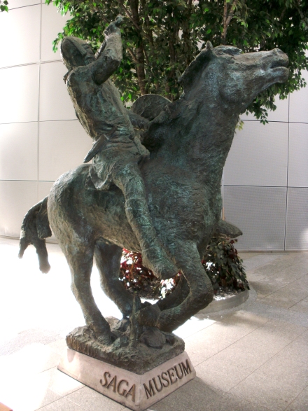 und die Bronzeskulptur eines berittenen Nordmannes stehen vor dem eingang