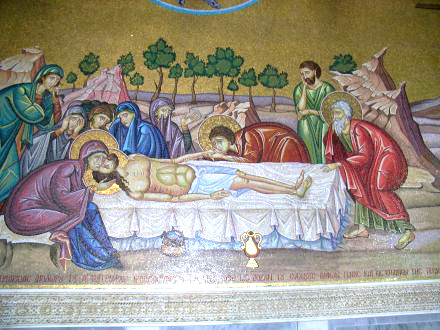 Jesus nach der Abnahme vom Kreuz gelegt, gesalbt und in sein Grabtuch gewickelt