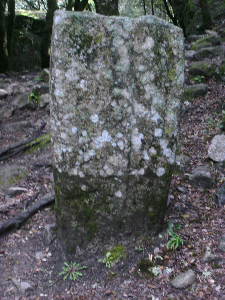 steht eine aus zwei Fragmente bestehende, verwitterte Menhirstatue