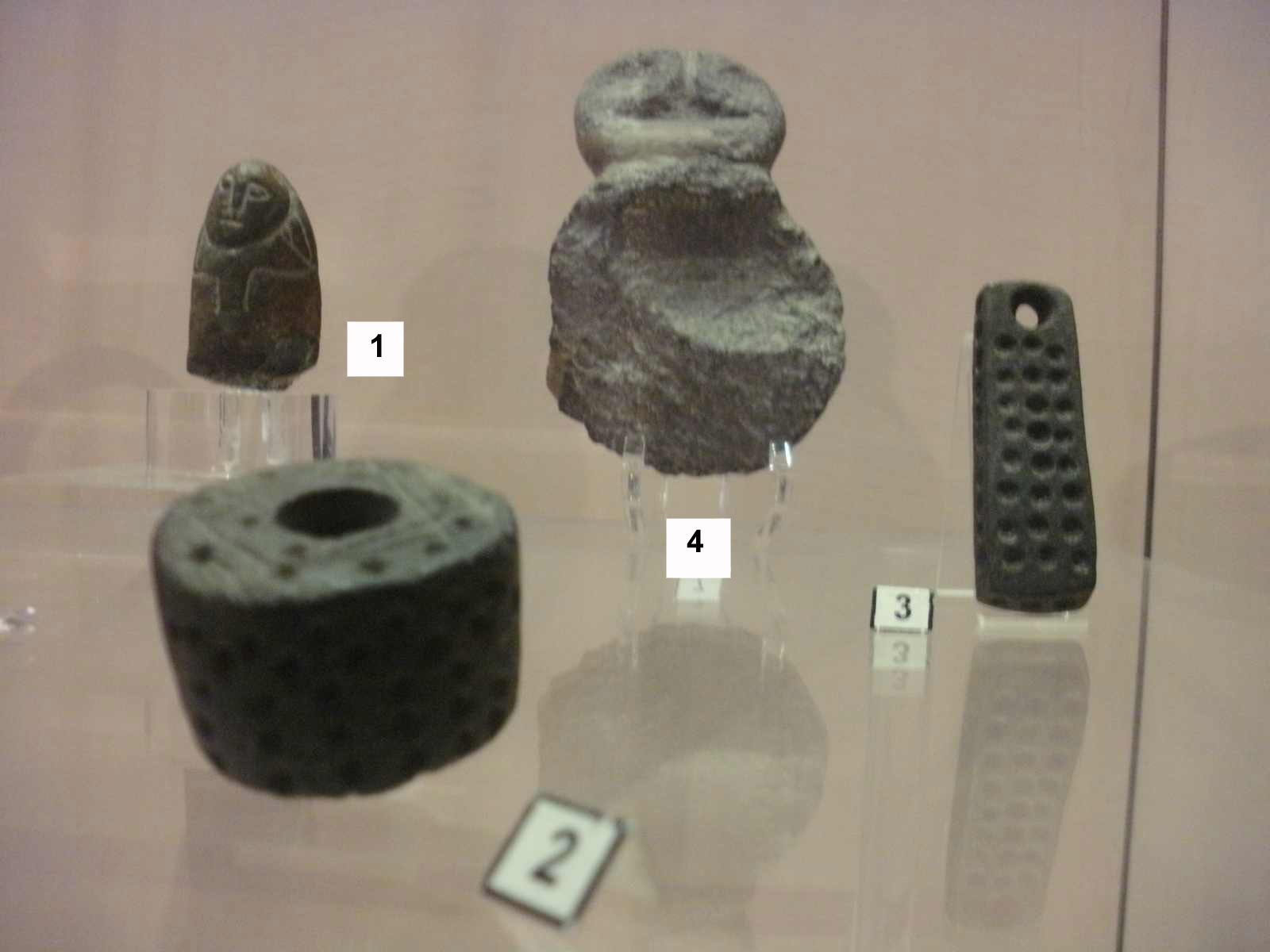 (Foto rechts): Rollenförmige Statuette (1), Dekorierte Spindel
