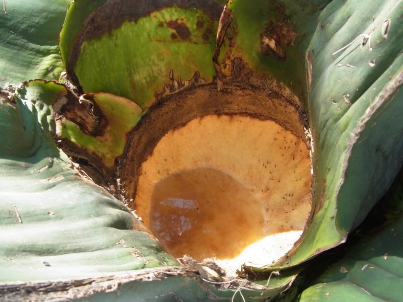 verwendet wird. Der fermentierte weißliche Saft (Foto rechts)