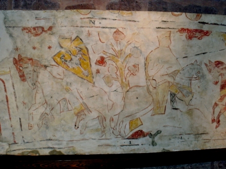 Wandfresko, der Ritter links trägt einen